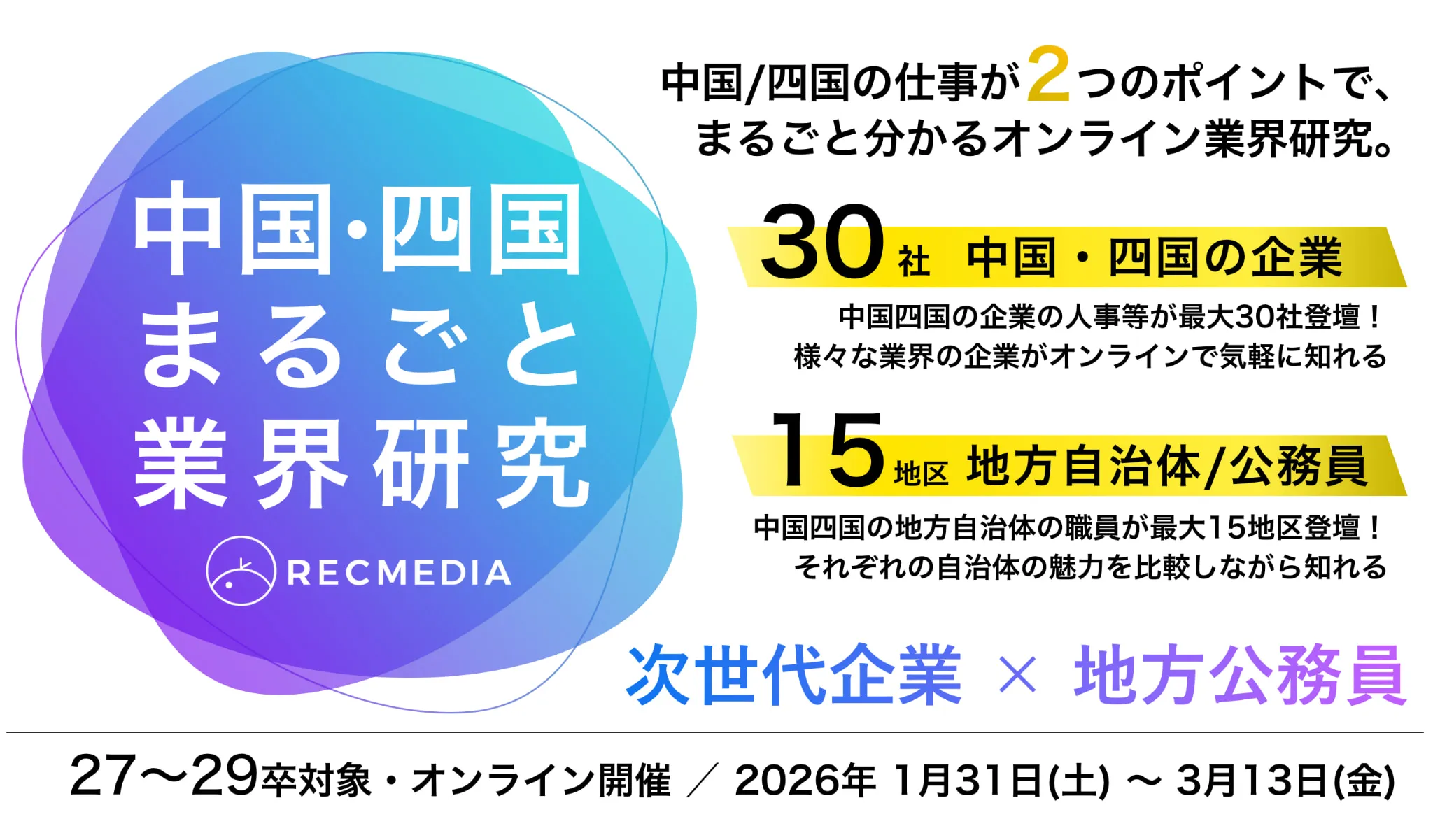主に、27卒対象の就活イベント。中国/四国の大手企業/隠れ優良企業や地方自治体(公務員)がオンライン登壇!幅広い業種・職種に関する仕事内容・インターン案内・早期選考等の説明会を実施。ZOOMを使って、カメラOFF・ミュートで参加、文系・理系どちらも参加OK!