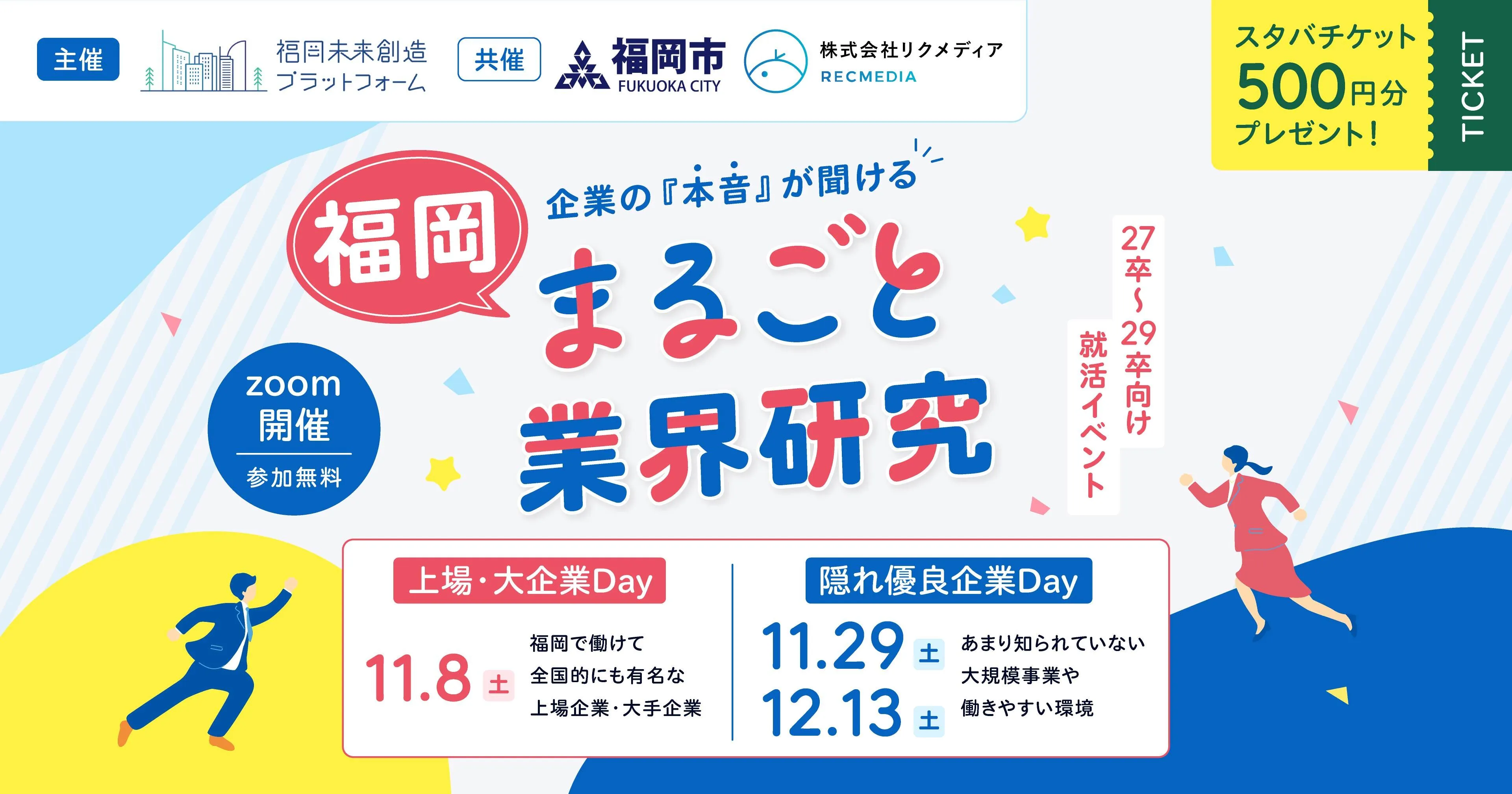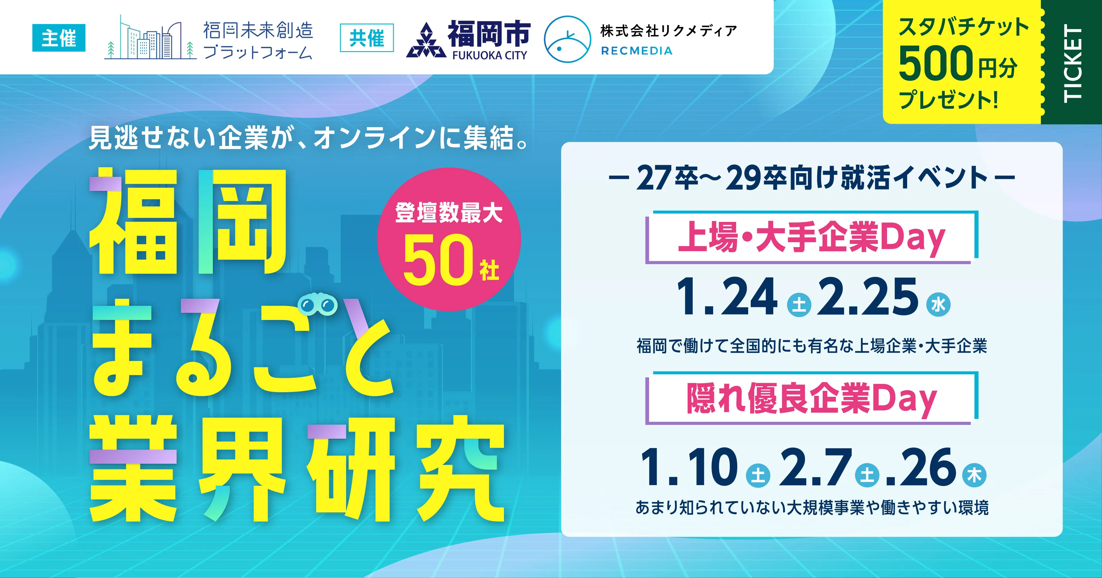 積極的に新卒採用を行う福岡で働ける大手企業・隠れ優良企業が集結する、夏のオンライン就活イベント。業界研究をはじめ、おすすめの夏インターン等の紹介や早期選考の案内など、福岡の企業の魅力がまるごと分かるオンライン就活イベントです。カメラOFF・ミュートでカジュアルに参加できる形式。文系・理系・学年問わず参加OKです!