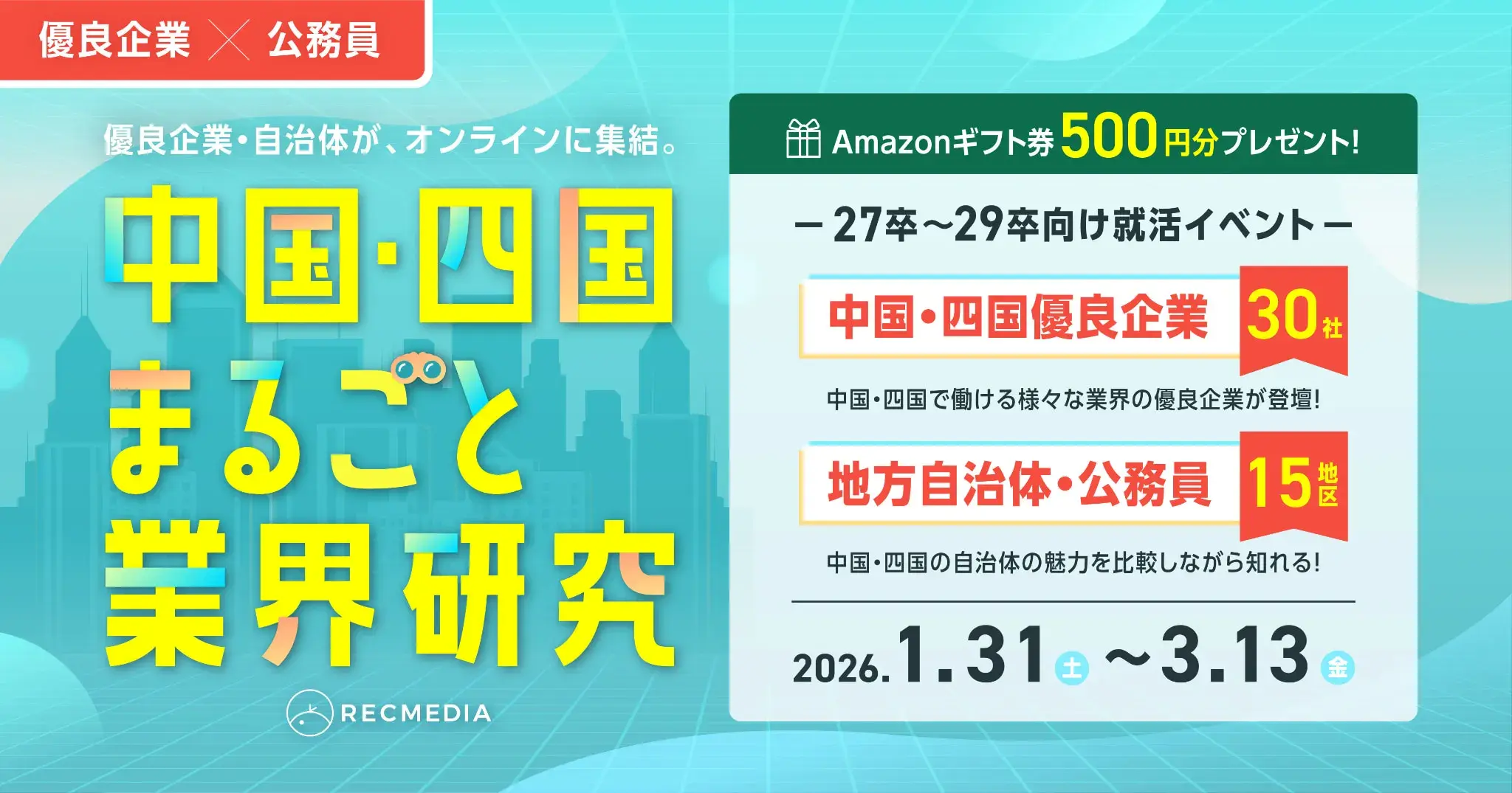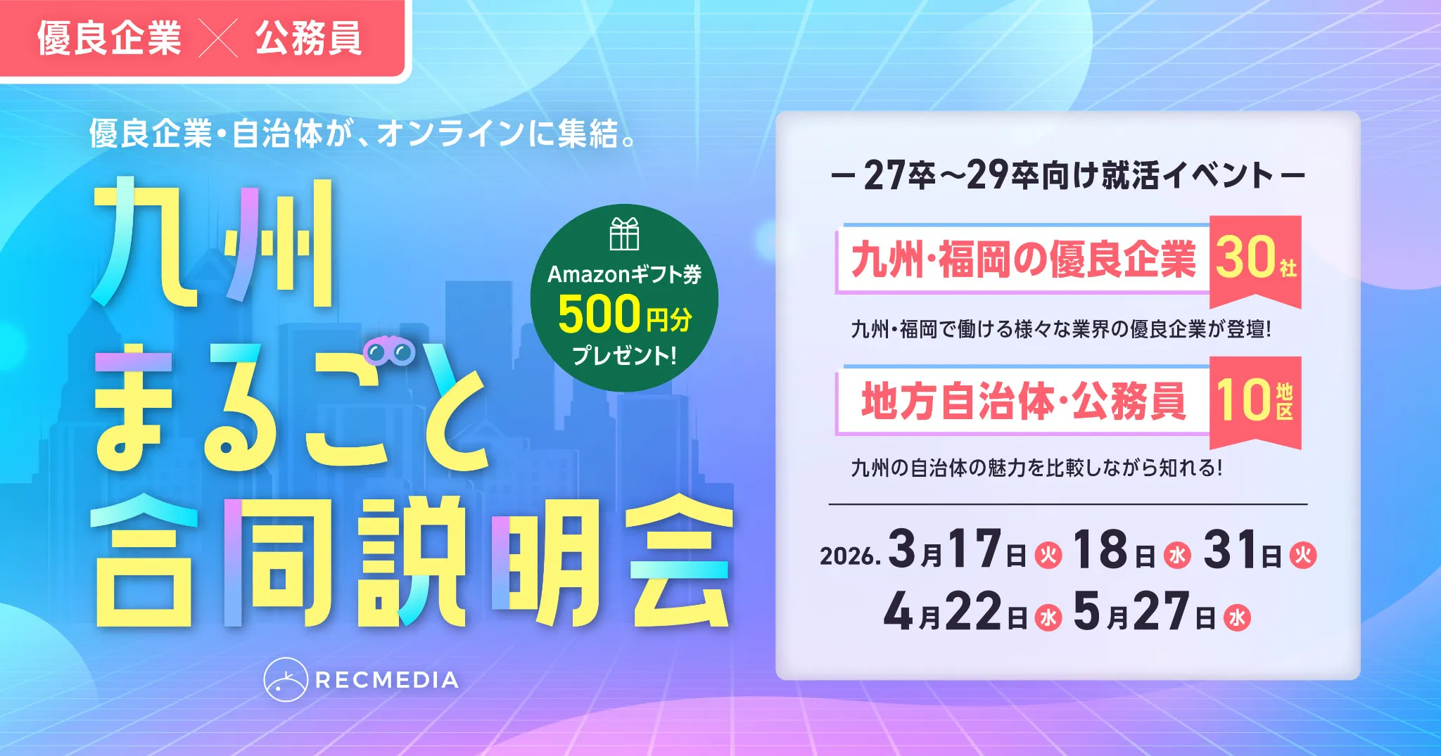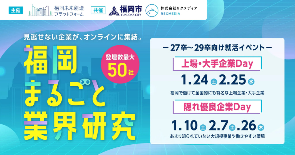 積極的に新卒採用を行う福岡で働ける大手企業・隠れ優良企業が集結する、夏のオンライン就活イベント。業界研究をはじめ、おすすめの夏インターン等の紹介や早期選考の案内など、福岡の企業の魅力がまるごと分かるオンライン就活イベントです。カメラOFF・ミュートでカジュアルに参加できる形式。文系・理系・学年問わず参加OKです!